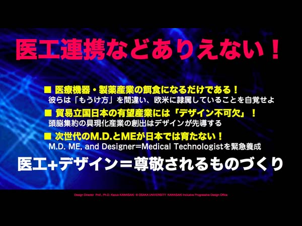 冒頭では、プレゼンテーション概要につづき、医工連携ということはあり得ず、医工学とデザインによって尊敬されるものづくりにつながるとの提言がなされました。具体的なデザインとして、眼鏡から人工心臓、そして、先端的な外科手術システムの事例を提示しました。そして、Bottom of Pyramid(BOP)のコンセプトとPeace-Keeping Designとの関係を論じ、これからの先導的な役割を語りました。